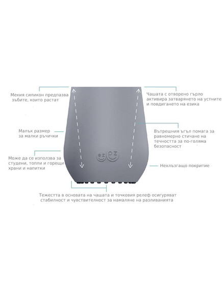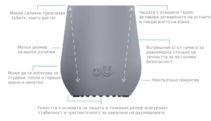 Да се научиш да пиеш от отворена чаша е важен етап от развитието. Обучителната чаша на EZPZ помага на бебето да премине от бутилка към чаша. Пиенето от отворена чаша помага за здравословно орално и говорно развитие, никнене на зъби и бебето да се научи да преглъщане силно.