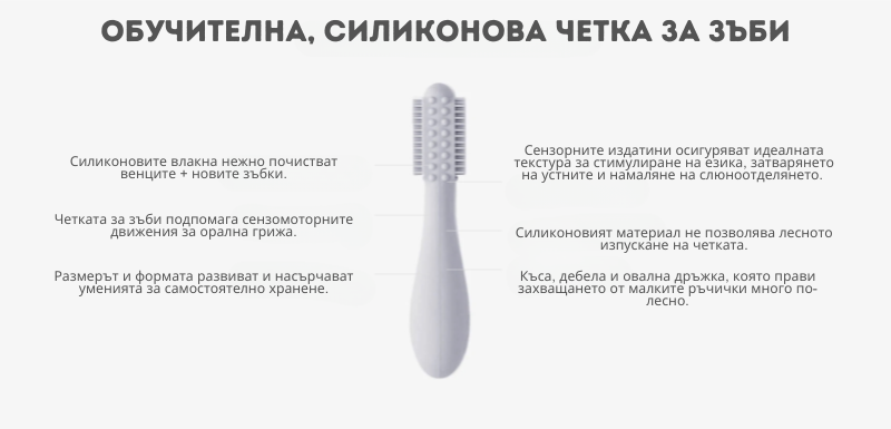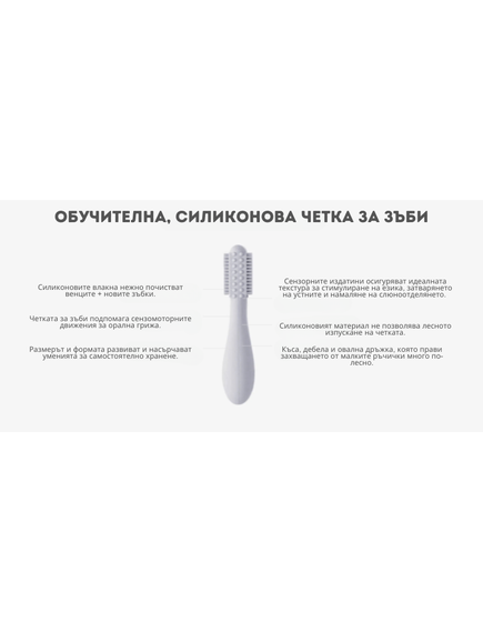 - Силиконовите влакна на четката нежно почистват венците и новите зъбки;