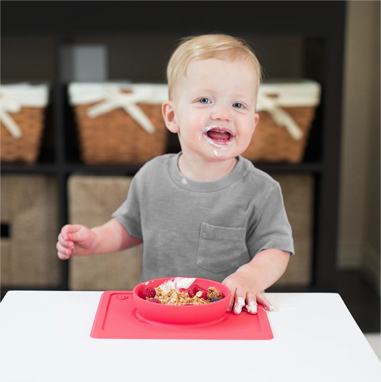 Изработена е от 100% мек силикон, а подложката в долната част прилепва плътно за към плота, което гарантира, че подложката няма да се плъзга. Така че - по-малко бъркотия в кухнята! Дори когато детето разсипе храната си, по-голямата част ще остане върху подложката. Например - ето как започва едно хранене и как завършва.