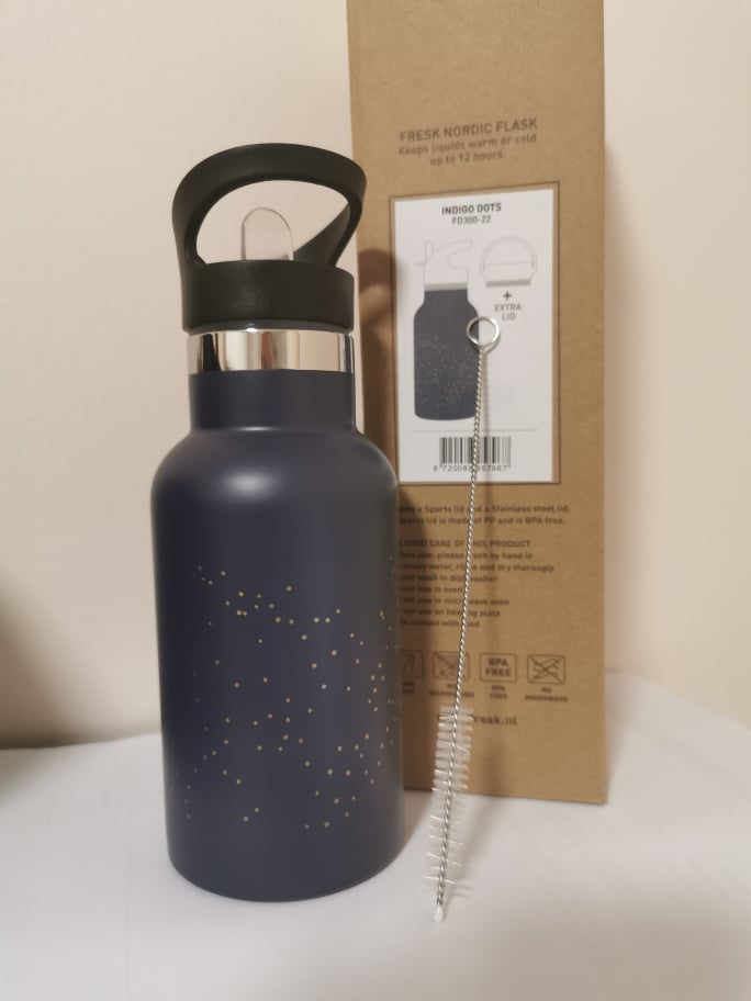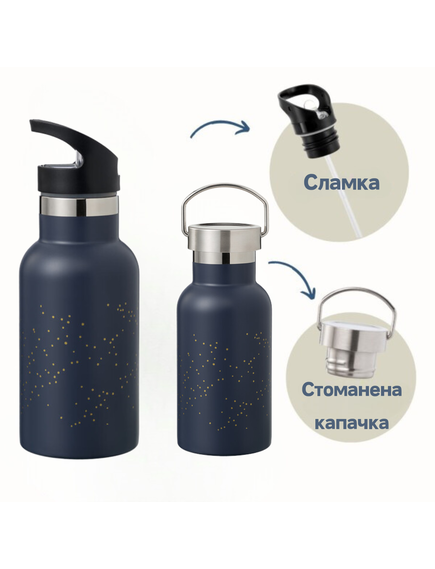 Идеален за деца, термосът е с вградена сламка и лесно се превръща в удобна и лесна за използване бутилка. За училище или разходка, с две различни капачки. Той има двойна стена от неръждаема стомана и държи вашата напитка топла или студена в продължение на много часове.