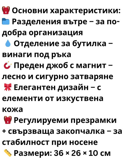 - Има регулируеми презрамки и елементи от изкуствена кожа, които придават по-елегантен вид.