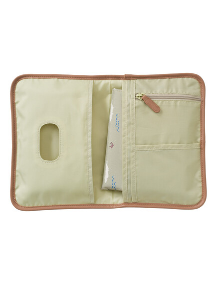Представлява здрав калъф с ластик за затваряне, така че нищо да не изпадне. При отваряне има подложка за смяна на памперси, два големи джоба и един с ципПодложката за преобличане се отваря лесно и се сгъва обратно с лекота. Можете лесно да почистите с влажна кърпа.