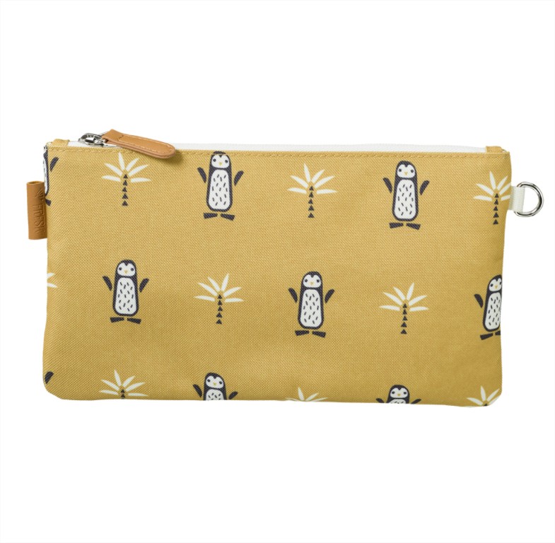 Затваря се с цип и има малък метален пръстен, чрез който можете да го закачите на чантата си.