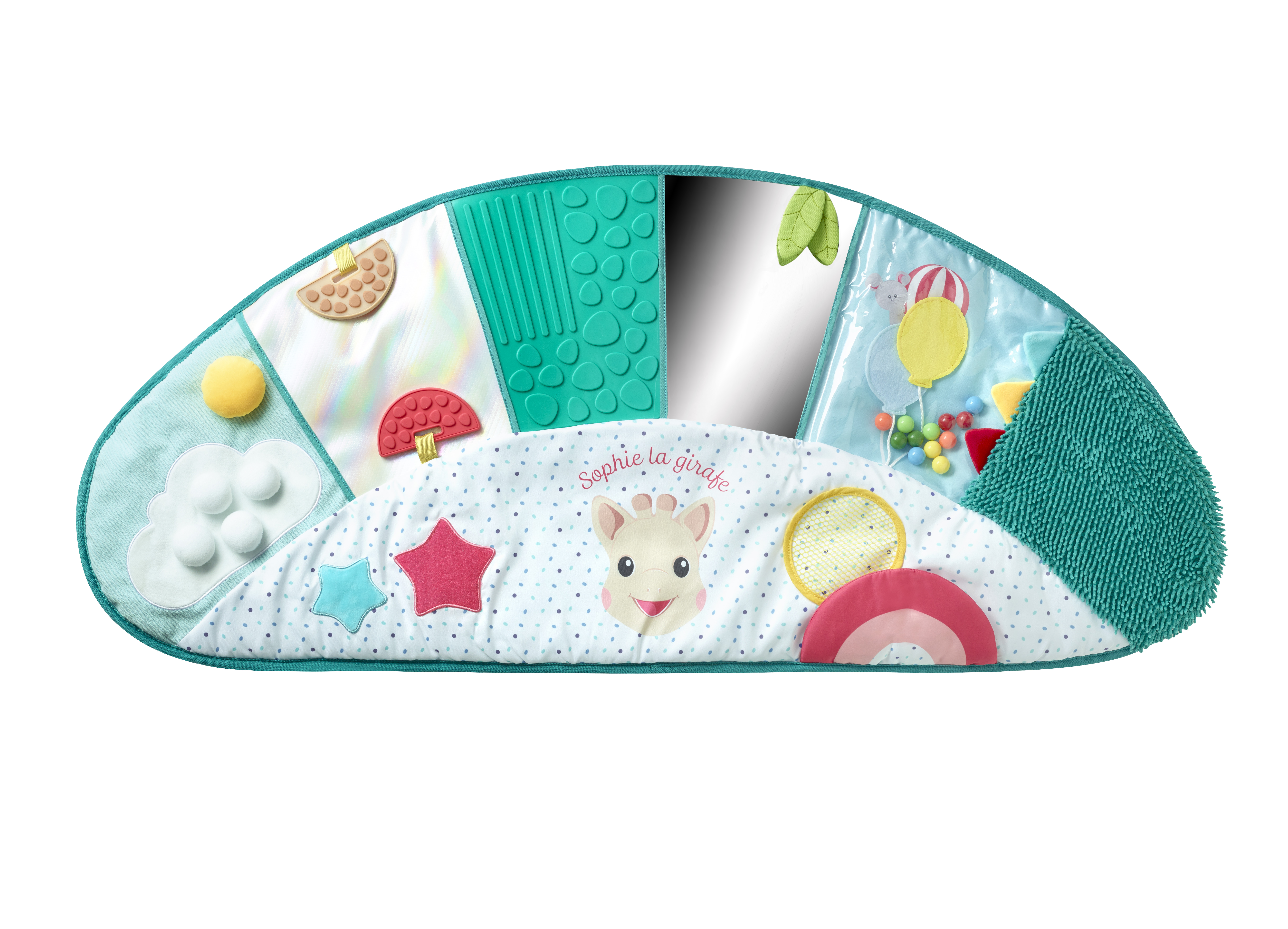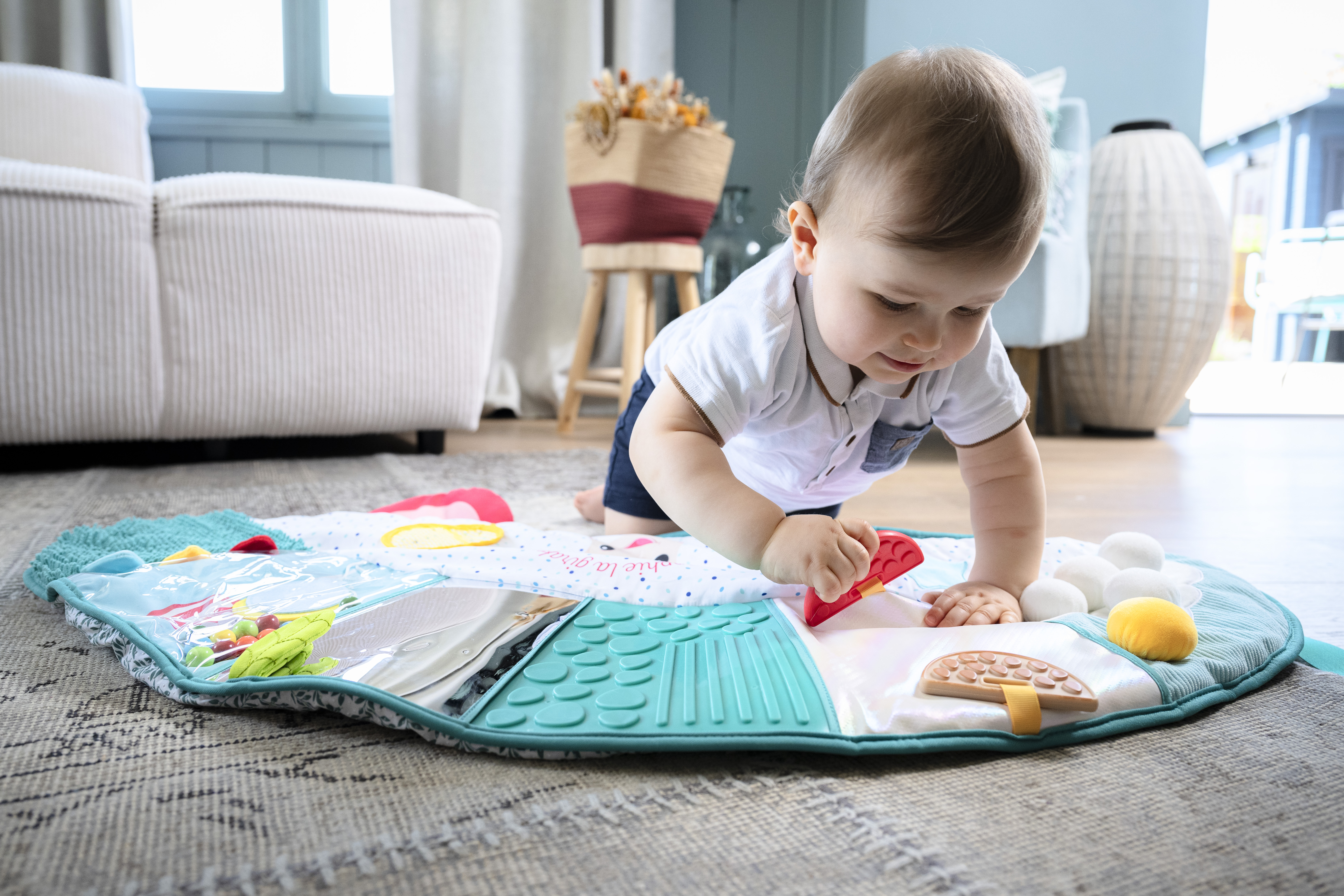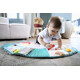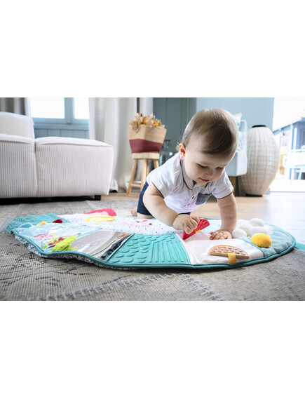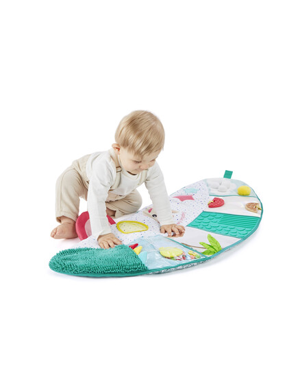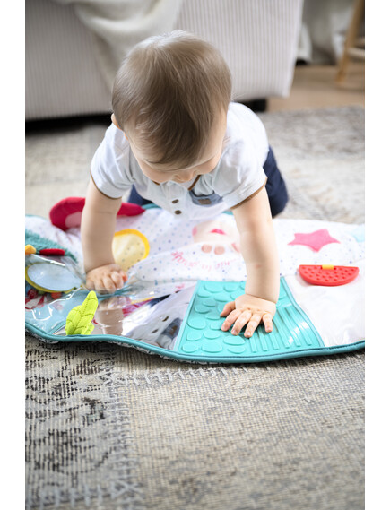 - Сетивно развитие: С текстури, които стимулират осезанието, релефни елементи, огледалца, звуци на смачкана хартия и гризалки, матрачето подпомага сетивното изследване на детето, предлагайки му постоянни стимули.