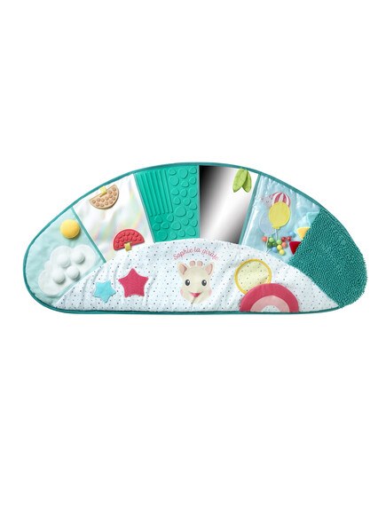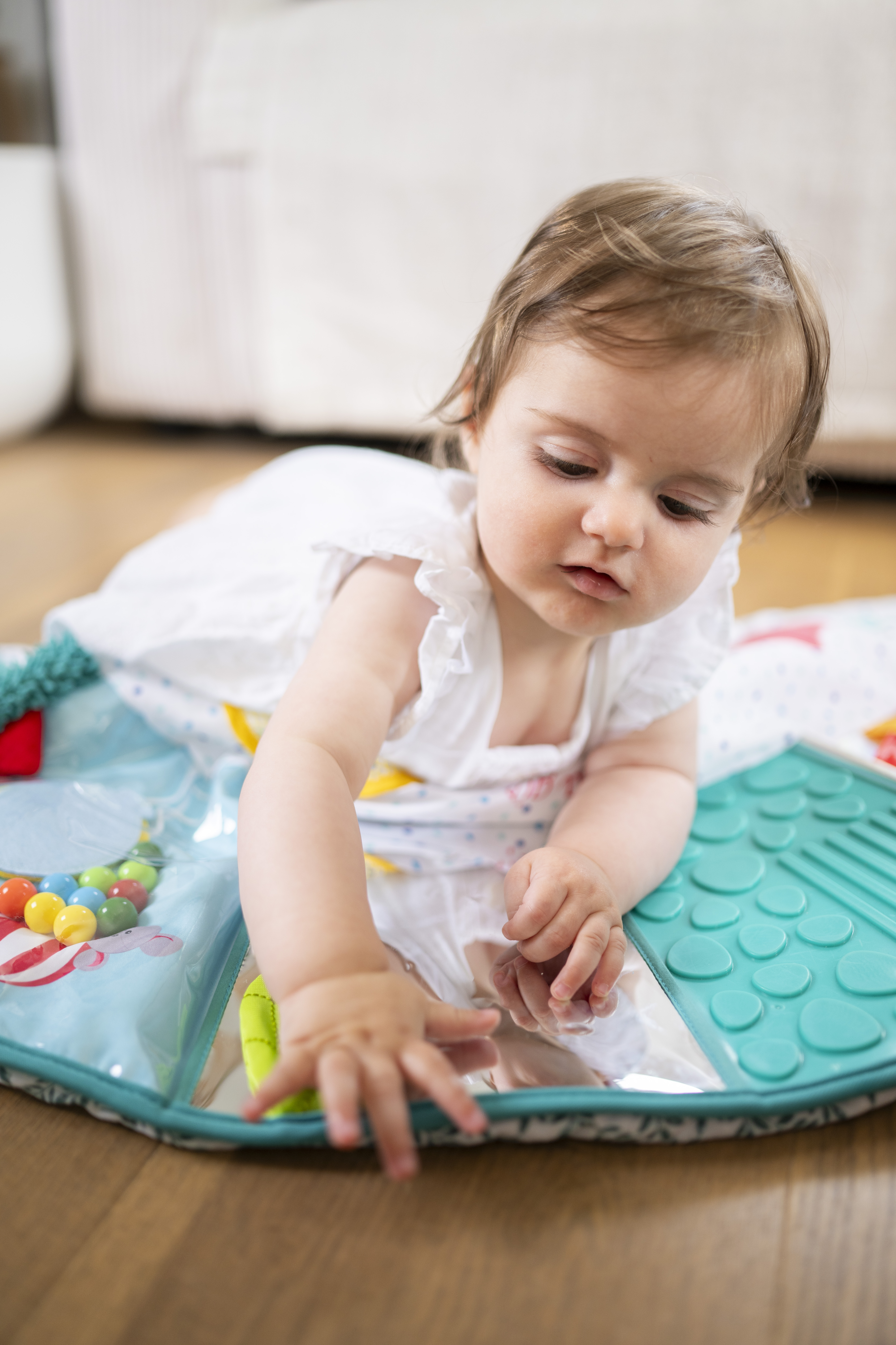 - Сетивно развитие: С текстури, които стимулират осезанието, релефни елементи, огледалца, звуци на смачкана хартия и гризалки, матрачето подпомага сетивното изследване на детето, предлагайки му постоянни стимули.