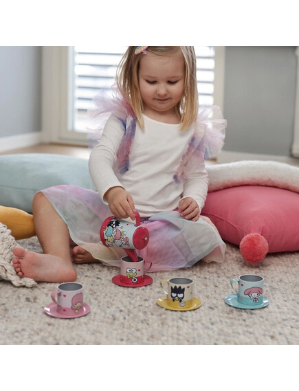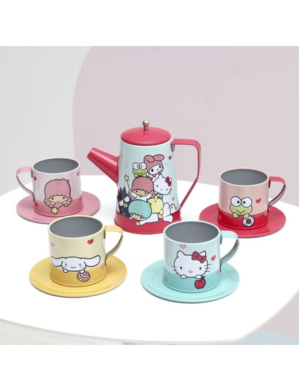Всяка част от комплекта е с изображения на Hello Kitty и останалите от нейната щура тайфа. Комплектът включва чайник с капак, 4 чаени чашки и 4 чаени чинийки.