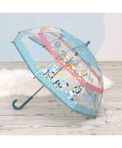 Детски чадър с любимото на децата кученце - Bluey Със своите забавни илюстрации от света на Bluey, този весел детски чадър, ще освежи всеки мрачен и дъждовен ден.  Характеристики : Пластмаса, полиестер Възраст: 3+ години Размери: 630X700X700 мм