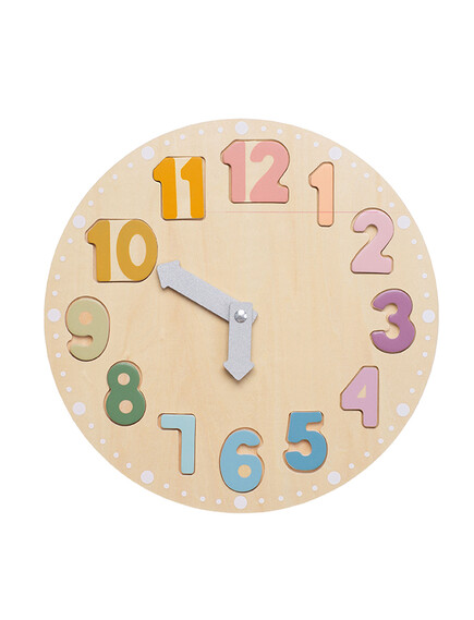 Прекрасен дървен часовник със свалящи се числа в различни цветове, с който детето ще учи часа и числата по забавен начин.