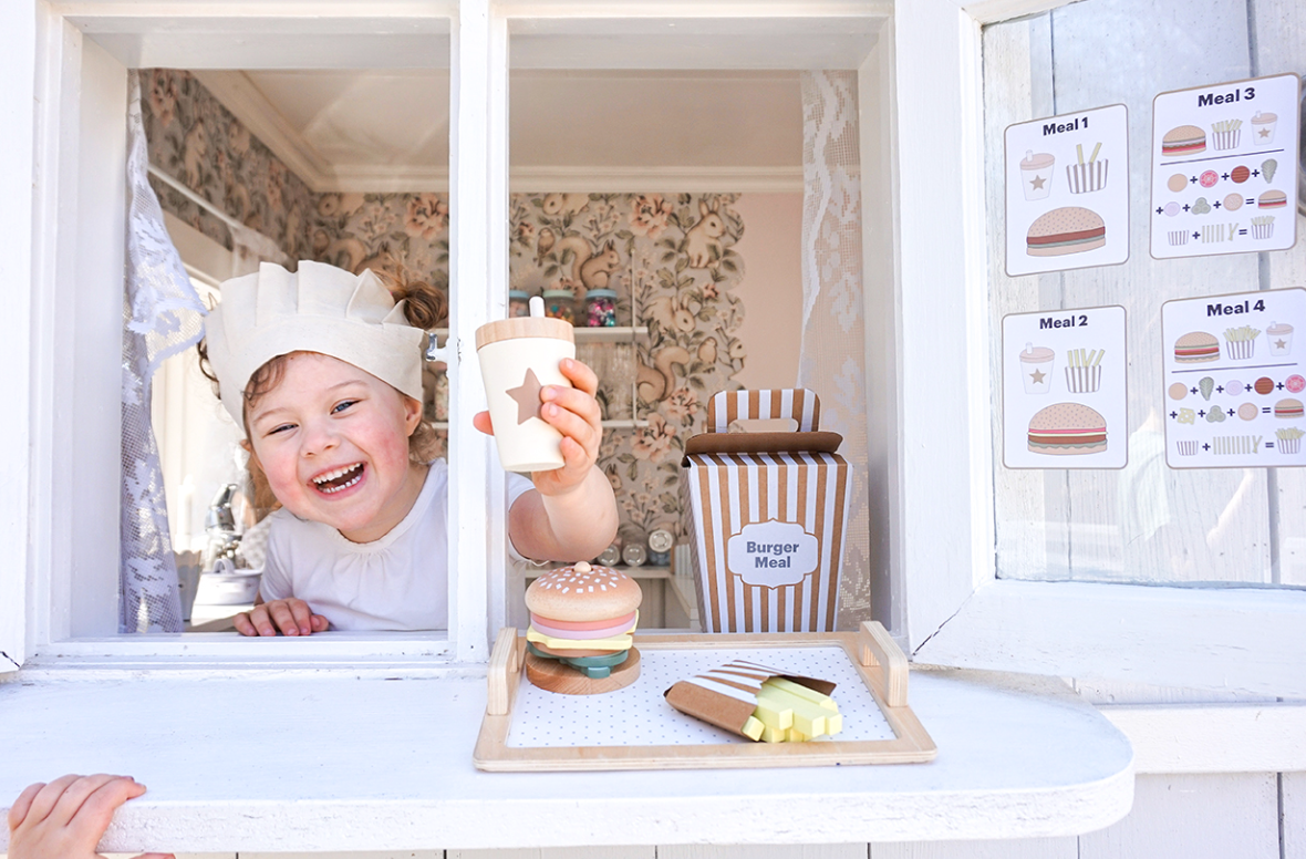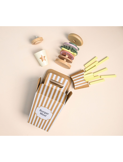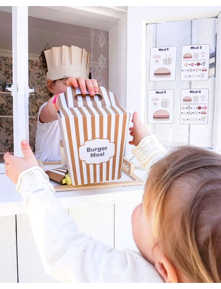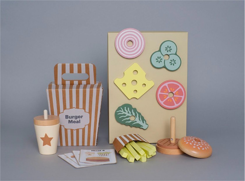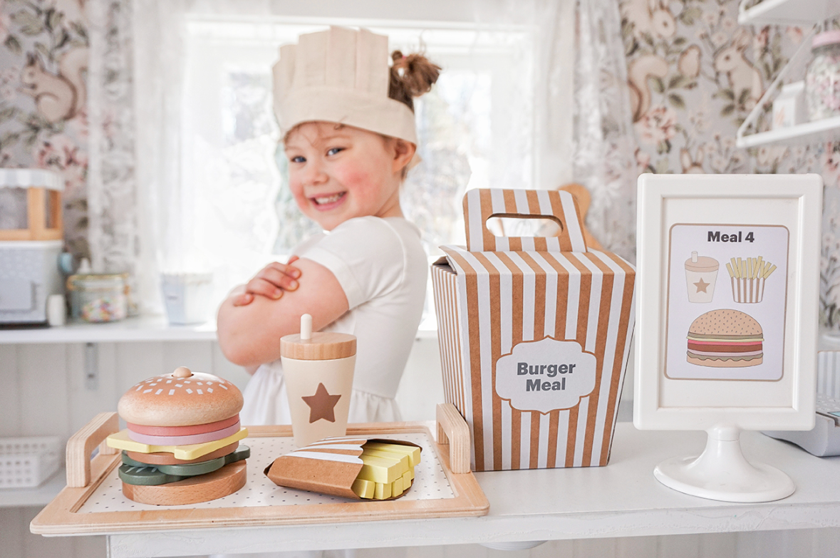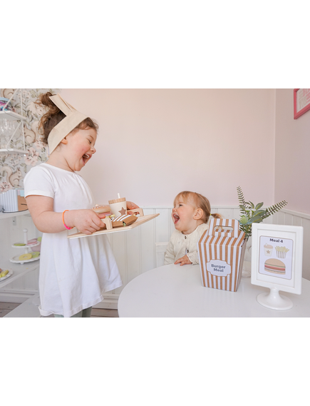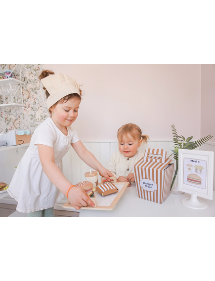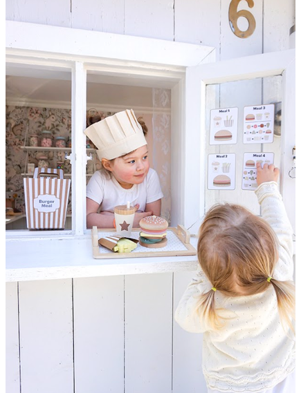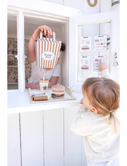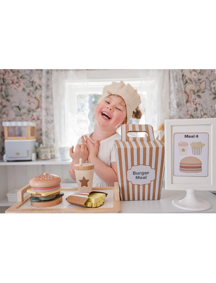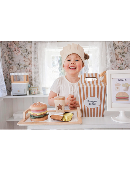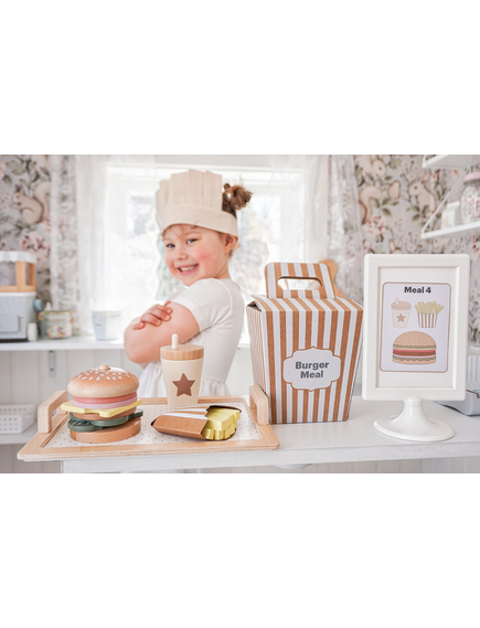 Четирите меню карти предлагат различни комбинации между бургер, пържени картофи и напитка, като оставят въображението на детето да води играта. Игра, която насърчава креативността и ролевата игра.