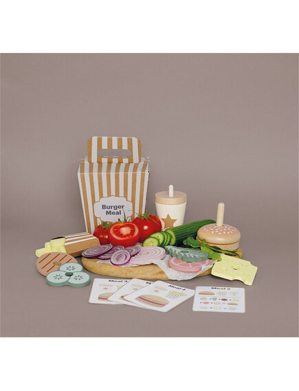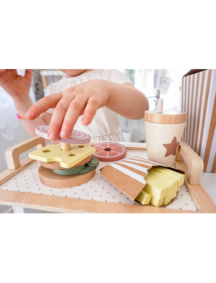 С нашия страхотен бургер сет децата могат да създават безброй вкусни комбинации, вдъхновени от включените меню карти. Бургерът е за подреждане, което позволява на детето да избере кои съставки да добави към всяка поръчка.