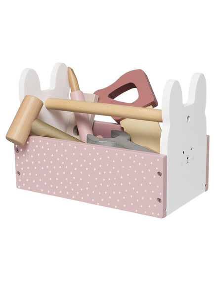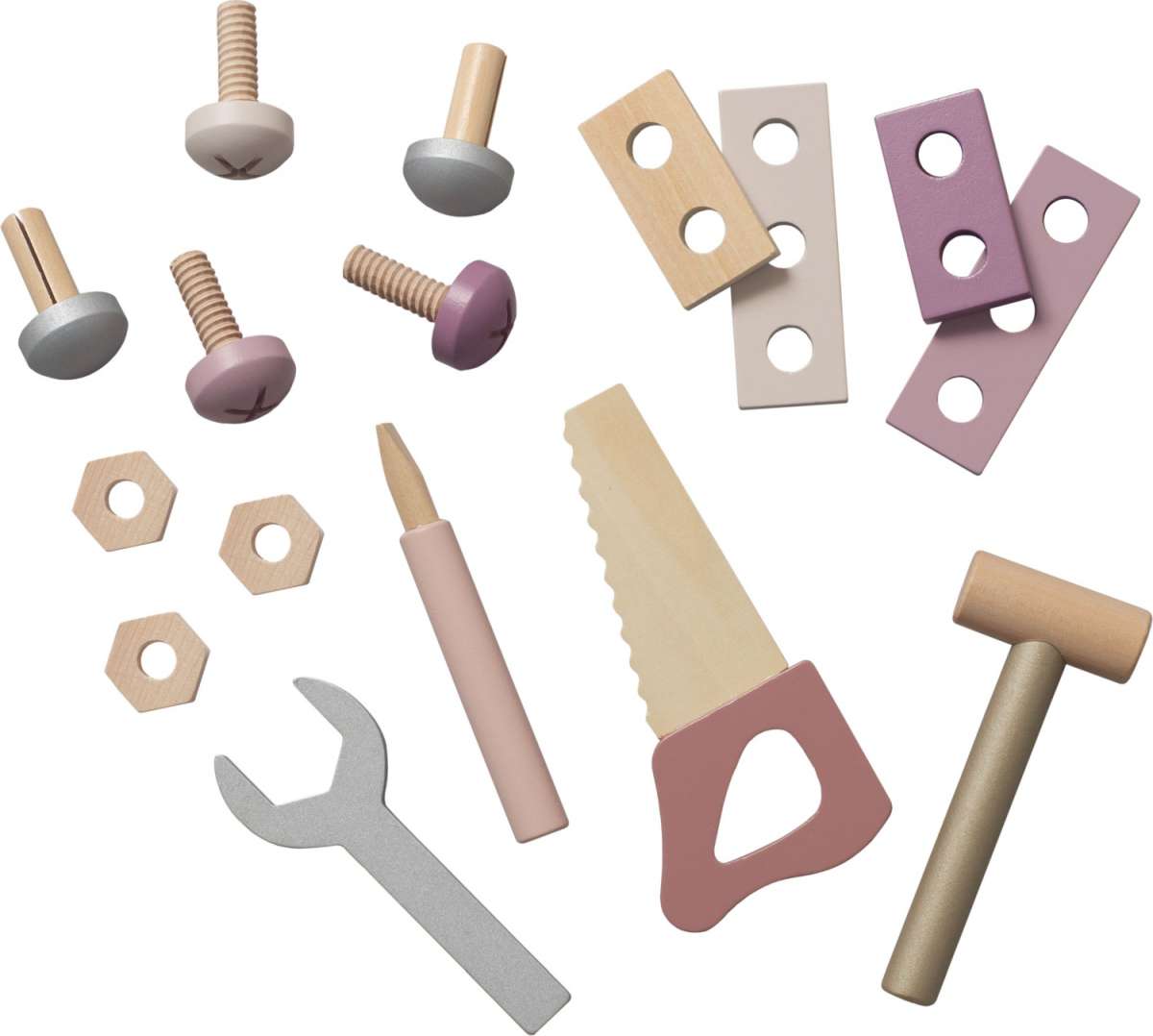 1 куфар, 1 трион, 1 гаечен ключ, 1 отвертка, 1 чук, 2 пирона, 2 винта, 3 гайки and 4 пластинки.
