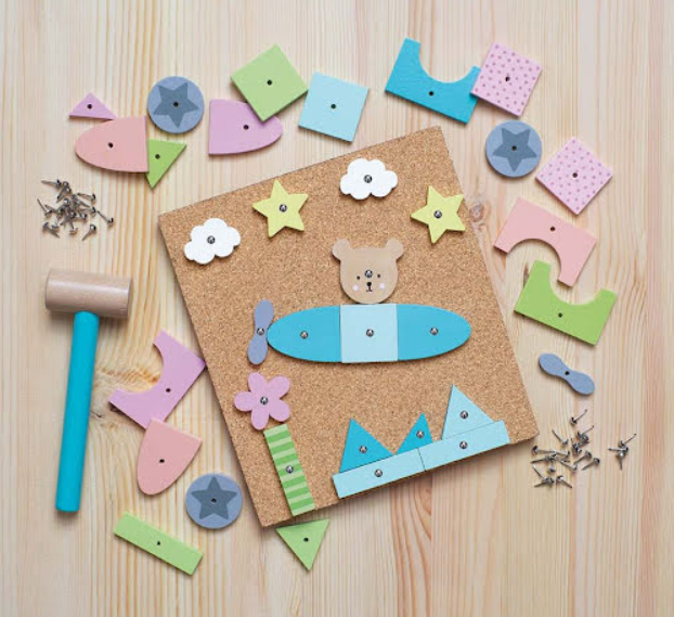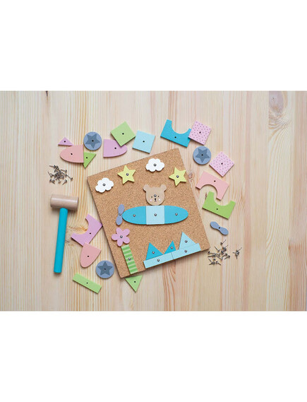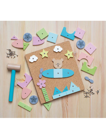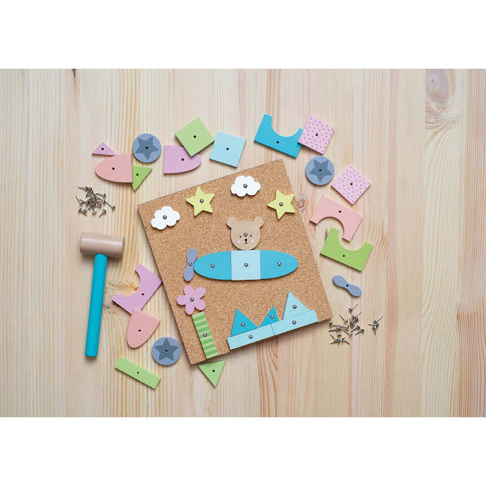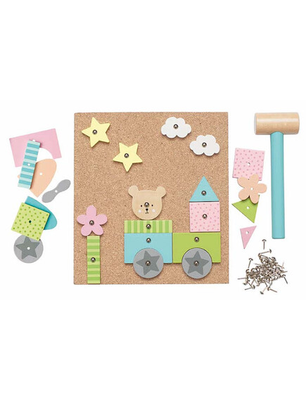 В сета ще намерите цветни фигури, пирони, дървен чук и коркова дъска върху която въображението на детето ще може да се развихри.