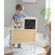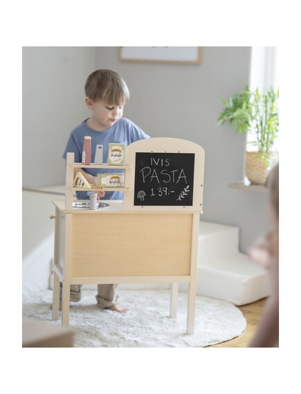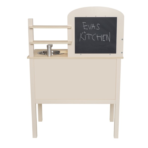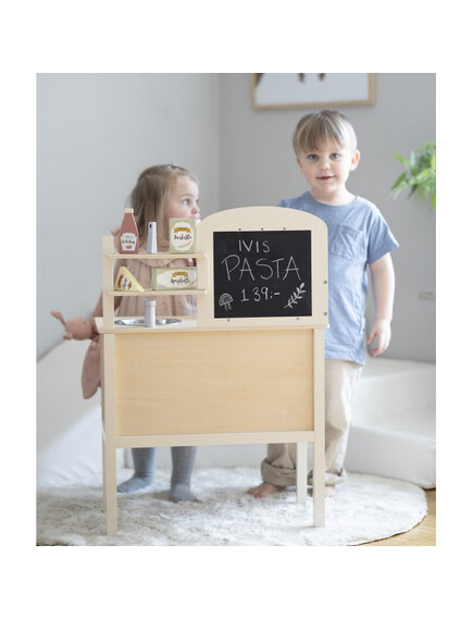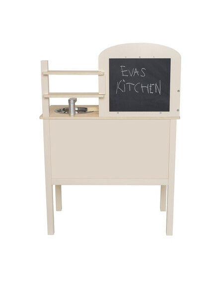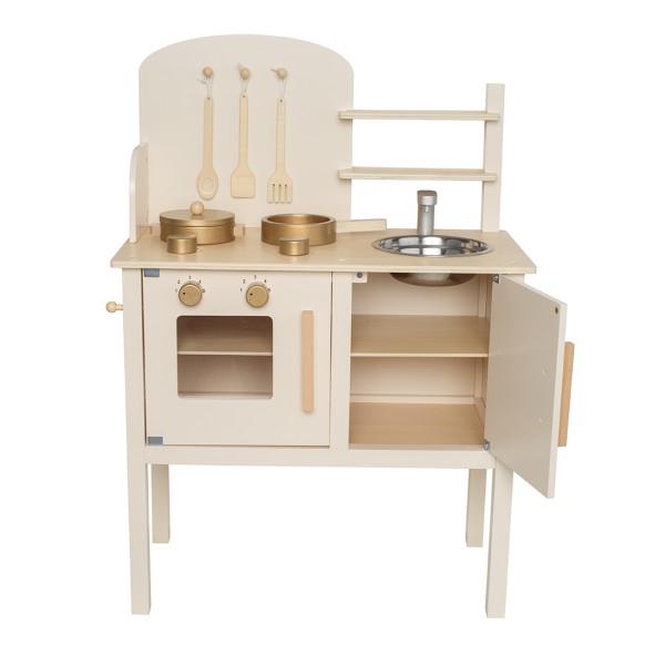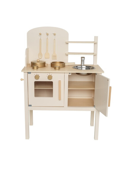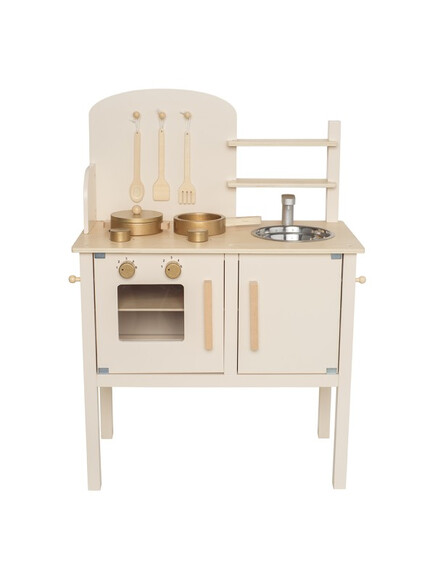 На стената има куки за закачване на кухненските прибори - дървени лъжица, вилица и шпатула. Комплектът съдържа 1 тенджера и 1 тиган за още по-реалистично изживяване. След като приключите с готвенето, можете да измиете съдовете в мивката.