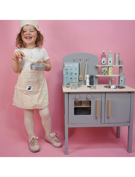 На стената има куки за закачване на кухненските прибори - дървени лъжица, вилица и шпатула. Комплектът съдържа 1 тенджера и 1 тиган за още по-реалистично изживяване. След като приключите с готвенето, можете да измиете съдовете в мивката.