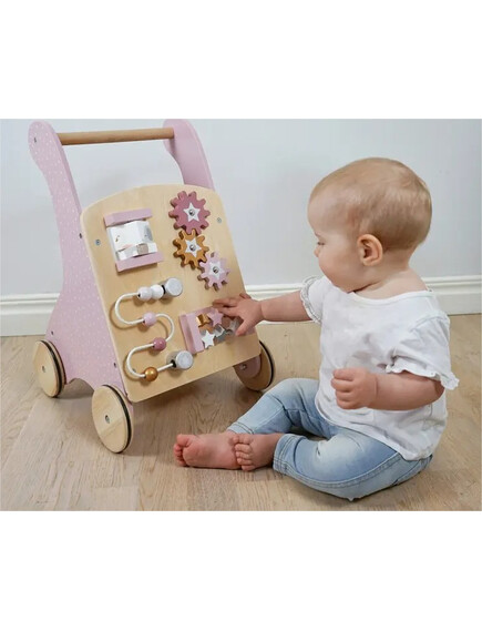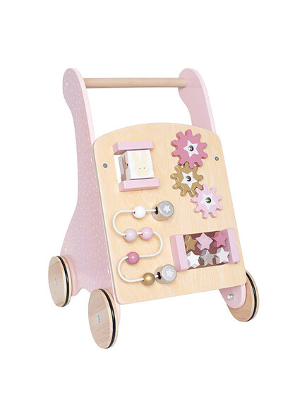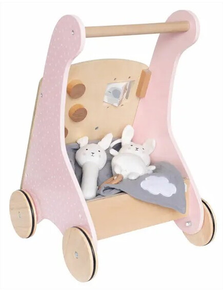 Количката има и дървени колела, но с гумен ръб, за да сте сигурни, че подът няма да пострада, а детето ще може да борави лесно с нея. Проходилката има ръчно рисувани картинки отстрани, а отзад се крие удобен кош/ количка за съхранение и пренасяне на любимите играчки.