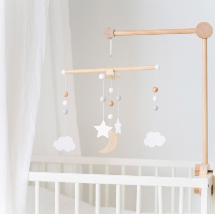 Играчката има окачени красиви облачета и звезди в центъра си. Разнообразните форми помагат на бебетата да развият сетивата и двигателните си умения.