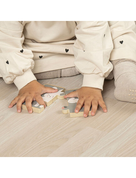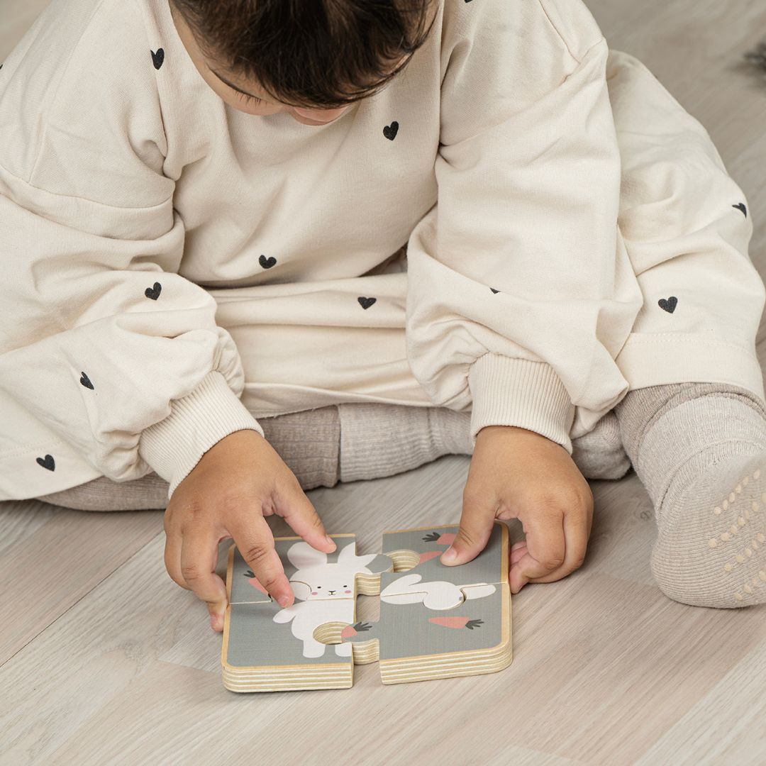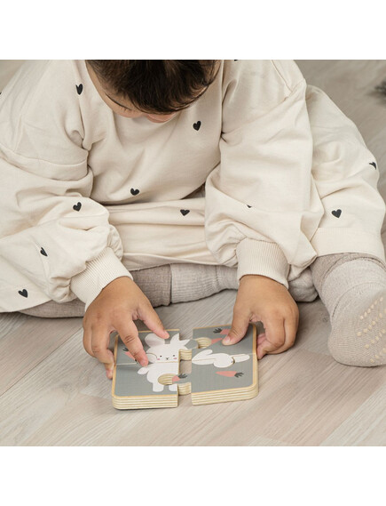 Двустранен пъзел с различна картинка от двете страни. Едната част е цветен пъзел, от другата трябва да направите зайче.