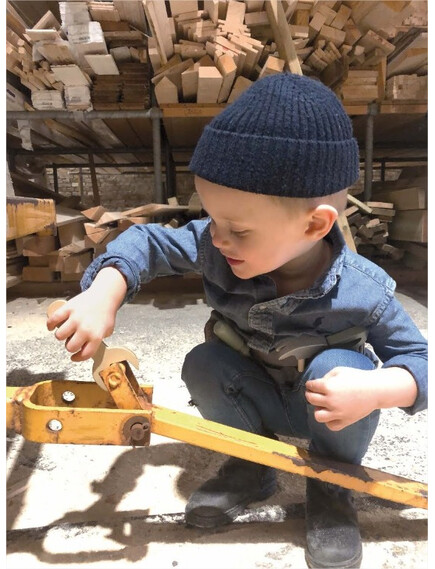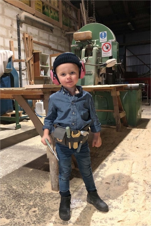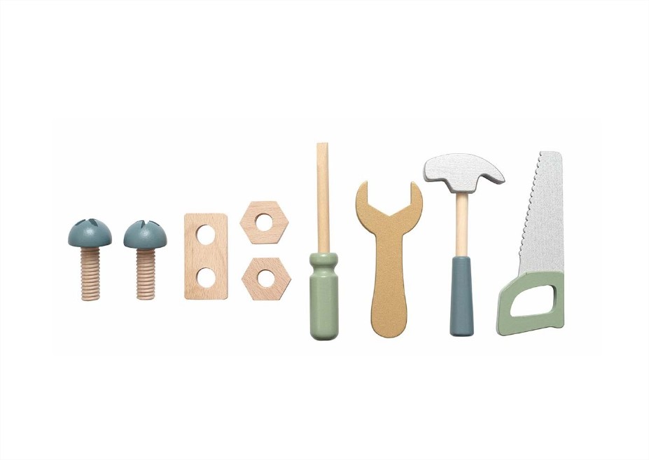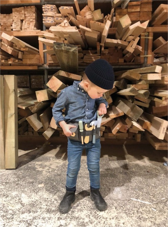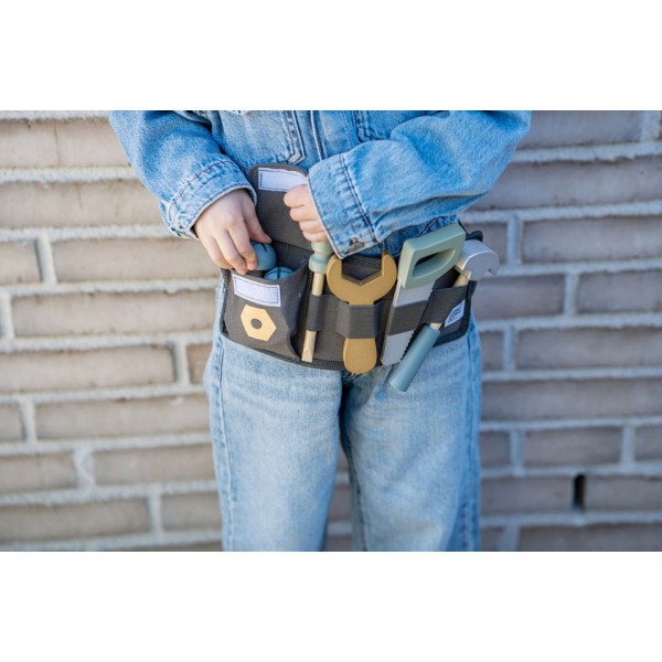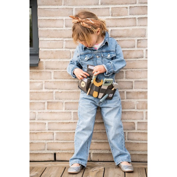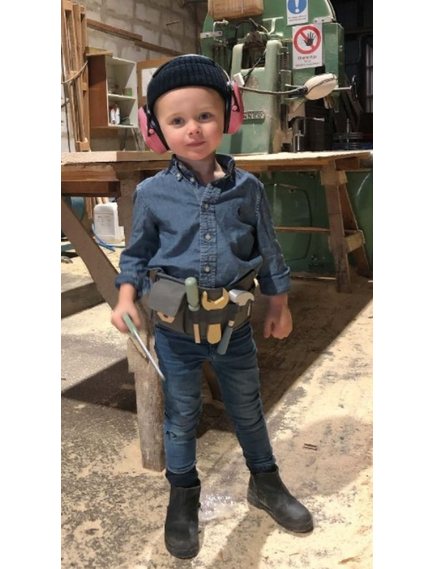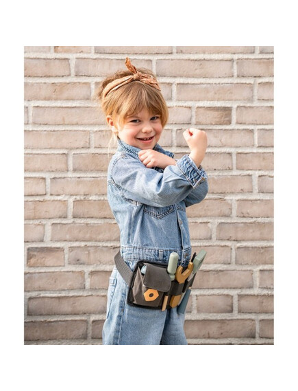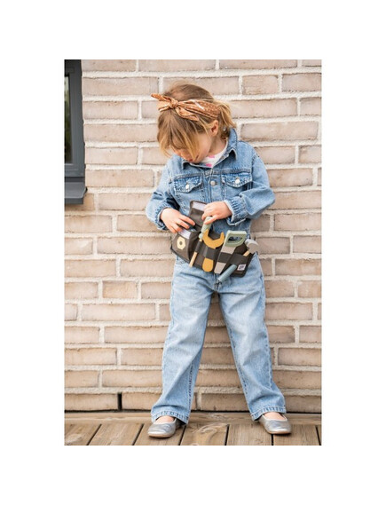 С най-важните инструменти и истински платнен колан, който прилепва добре около малката талия, детето ще се чувства като истински дърводелец.