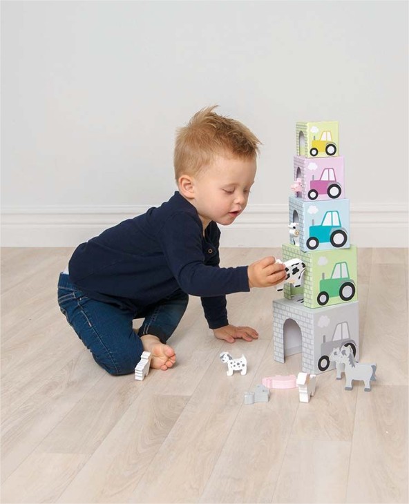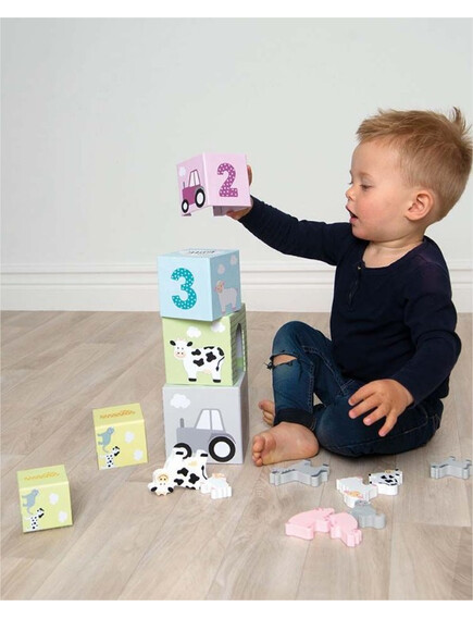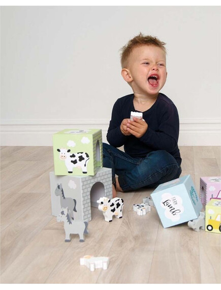 Образователни кубчета за редене с красиви картинки, в които малки дървени животинки намират подслон!