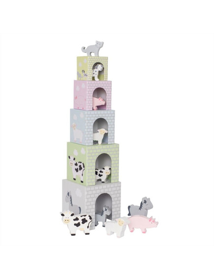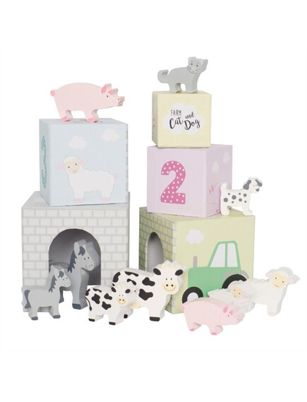Играта включва 5 кубчета с чудесно качество и естетика, както и 2 крави, 2 кончета, 2 прасенца, 2 агънца, 1 куче и 1 коте.