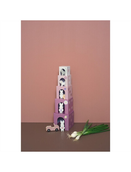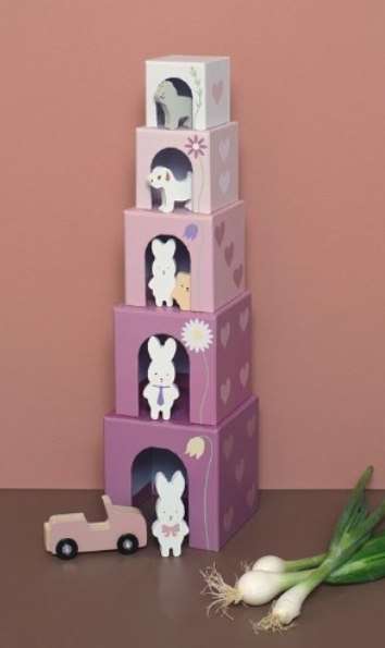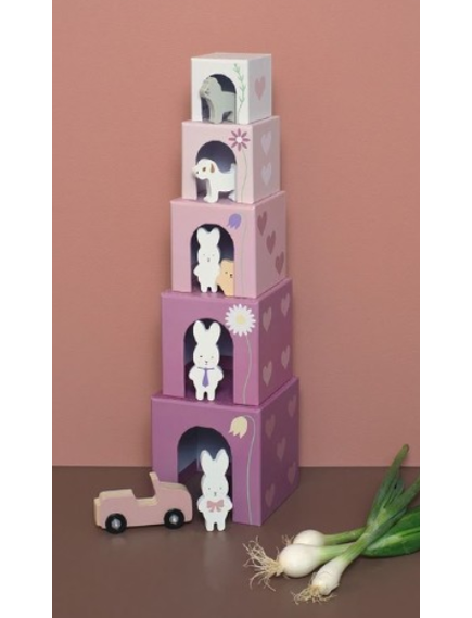 Играта включва 5 кубчета с отлично качество и естетика и 1 кола, 1 плюшено мече, 1 куче, 1 коте и 3 зайчета