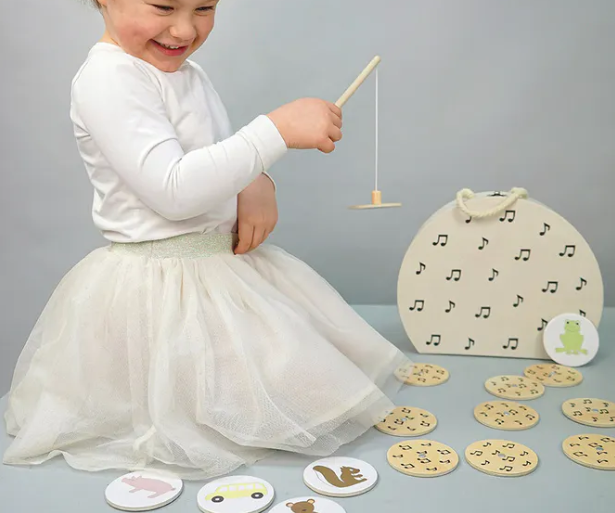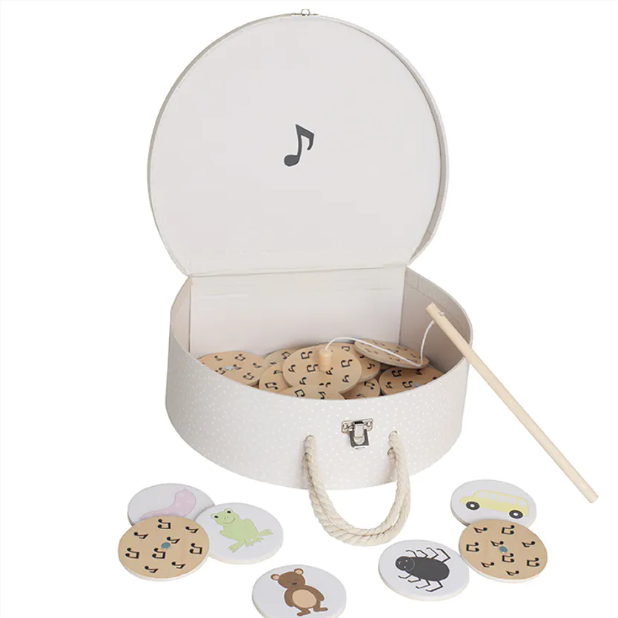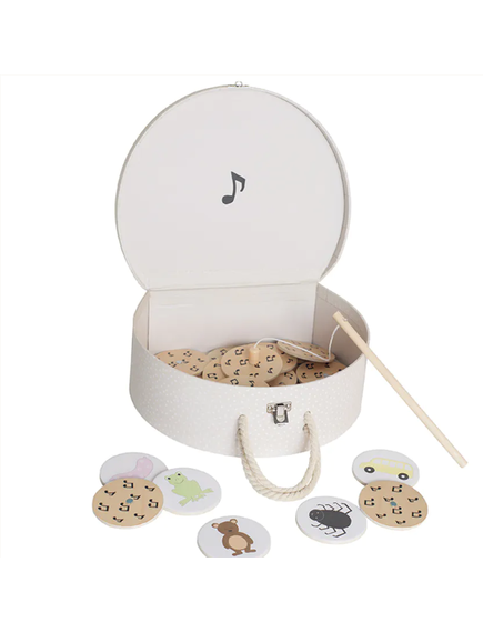 Куфарчето съдържа 23 карти с различни животни, като детето ще трябва да изпее песничка свързана с животното. С малката въдичка, то ще улови карта и ще изпее песен. Комбинирайки картинки с песнички ще развие креативността на детето и ще подобри способността му да прави асоциации.