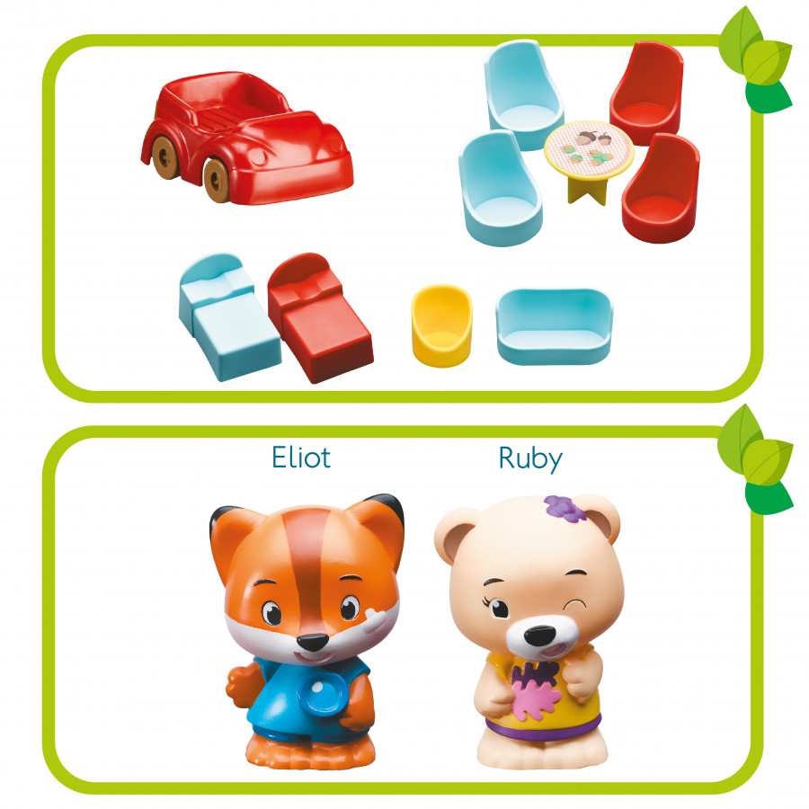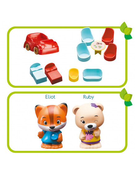 2 героя и 12 аксесоара (1 кола, 1 люлка, 1 храст-място за почивка, 2 легла, 1 маса, 4 стола, 1 пейка, 1 фотьойл)
