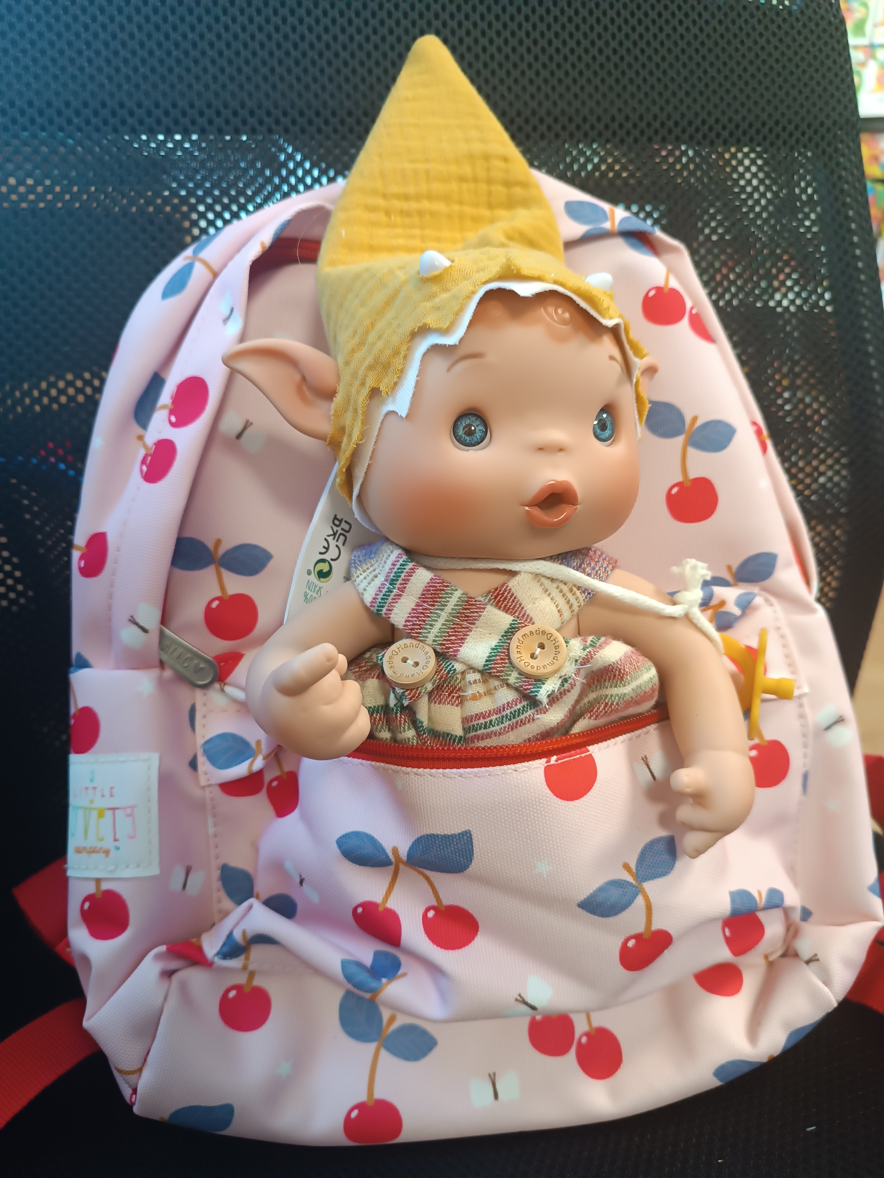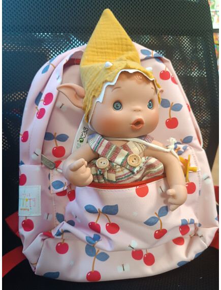 Комбо комплект „Магия и приключения“: Малка раничка A little lovely company "Cherries" + Ръчно изработена кукла от Испания - Duendy по избор