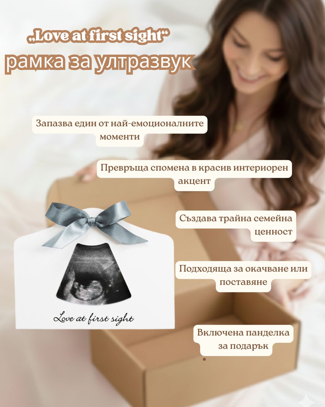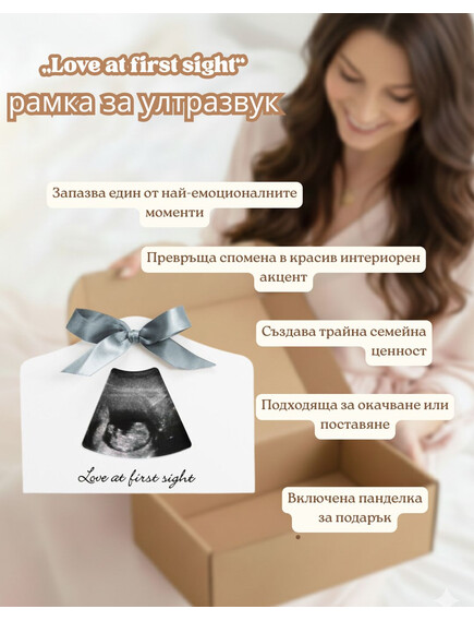 Тази нежна рамка е идеална за ултразвукова снимка и носи посланието „Любов от пръв поглед“. Прекрасен и емоционален акцент за дома или мил начин да споделите щастливата новина с близките.