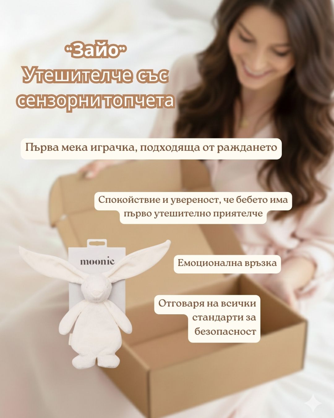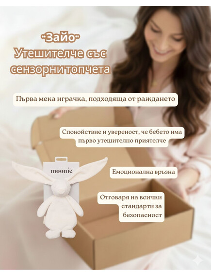 Нежно и изключително меко утешителче, създадено да бъде първият приятел на бебето още от първите дни. Зайчето MOONIE носи усещане за сигурност и комфорт, като стимулира сетивата чрез меките си материи и фините топченца в коремчето, които издават лек звук при движение. Перфектно за гушкане, успокояване и първи игри.