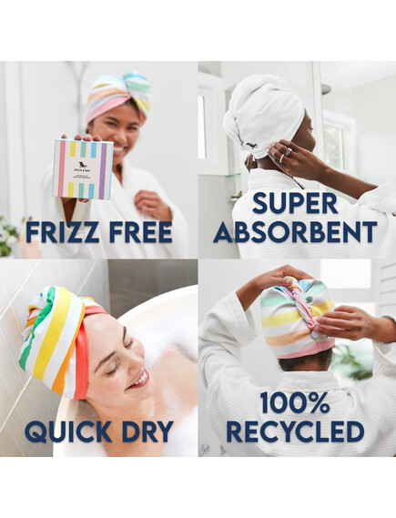 Тюрбанът изсушава косата до 3 пъти по-бързо от стандартна кърпа, без да я наелектризира и без излишно триене. Изработен е от 100% рециклирани материали и е толкова лек, че няма да усещате тежест или напрежение във врата.