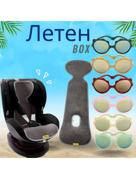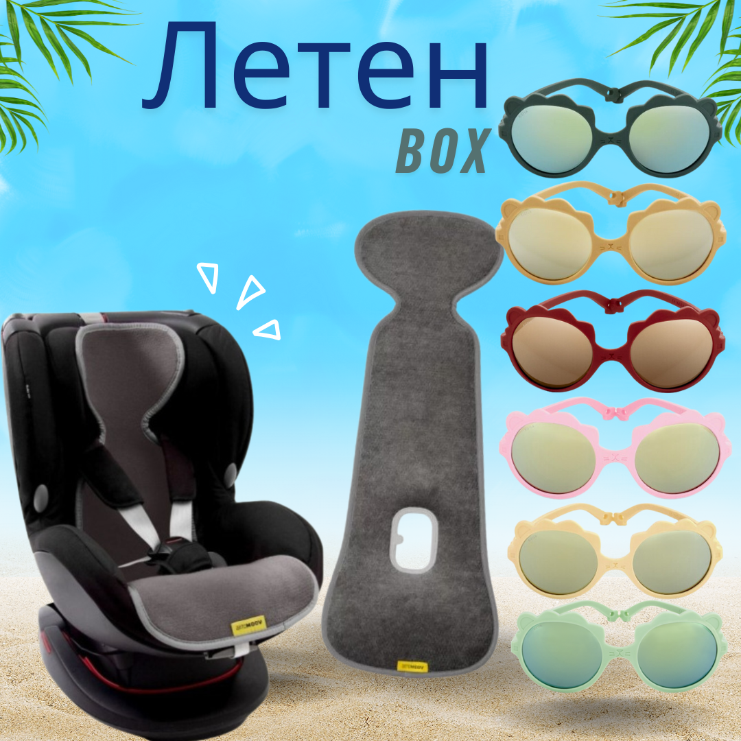 Летен BOX: Air Layer Подложка против изпотяване за столче за кола Група 1 (9-18кг) и някои видове колички - Антрацид + KiETLA: Слънчеви очила Lion 1-2 години - цвят по избор