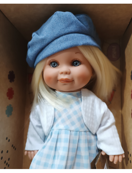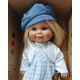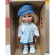 Облечена е с елече, красива рокличка и синя шапка.