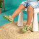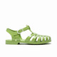 Сандалите са направени от мека, гъвкава гума и са с каишки. Имат подметка с малки "бутони", закръглени и затворени са при пръстите и са плетени, за да може въздуха свободно да преминава и краката да дишат!