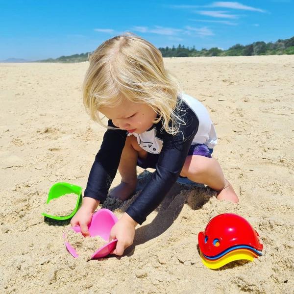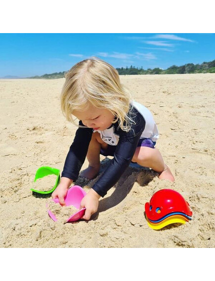 Minis могат да се подреждат и поставят в гнездо, те действат като лодки, лопати за пясък, купички за сладолед, въртящи се топки, състезателни коли или лъжици за снежни топки... Единственото ограничение е вашето въображение. Фантастичен инструмент за фина моторика и въображение.