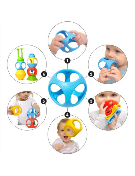 Ярките му цветове, начинът, по който непрекъснато променя формите и дупките, които има, помагат на децата лесно да го хванат с малките си ръце и да го вземат в устата си. Играйте и с него, хвърлете го, хванете го отново, натиснете го.