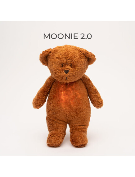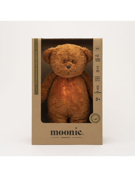 MOONIE ORGANIC 2.0: Приятелче за спокоен сън от органичен памук с нощна лампа и успокояващи звуци - МЕЧО "CARAMEL"