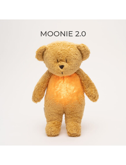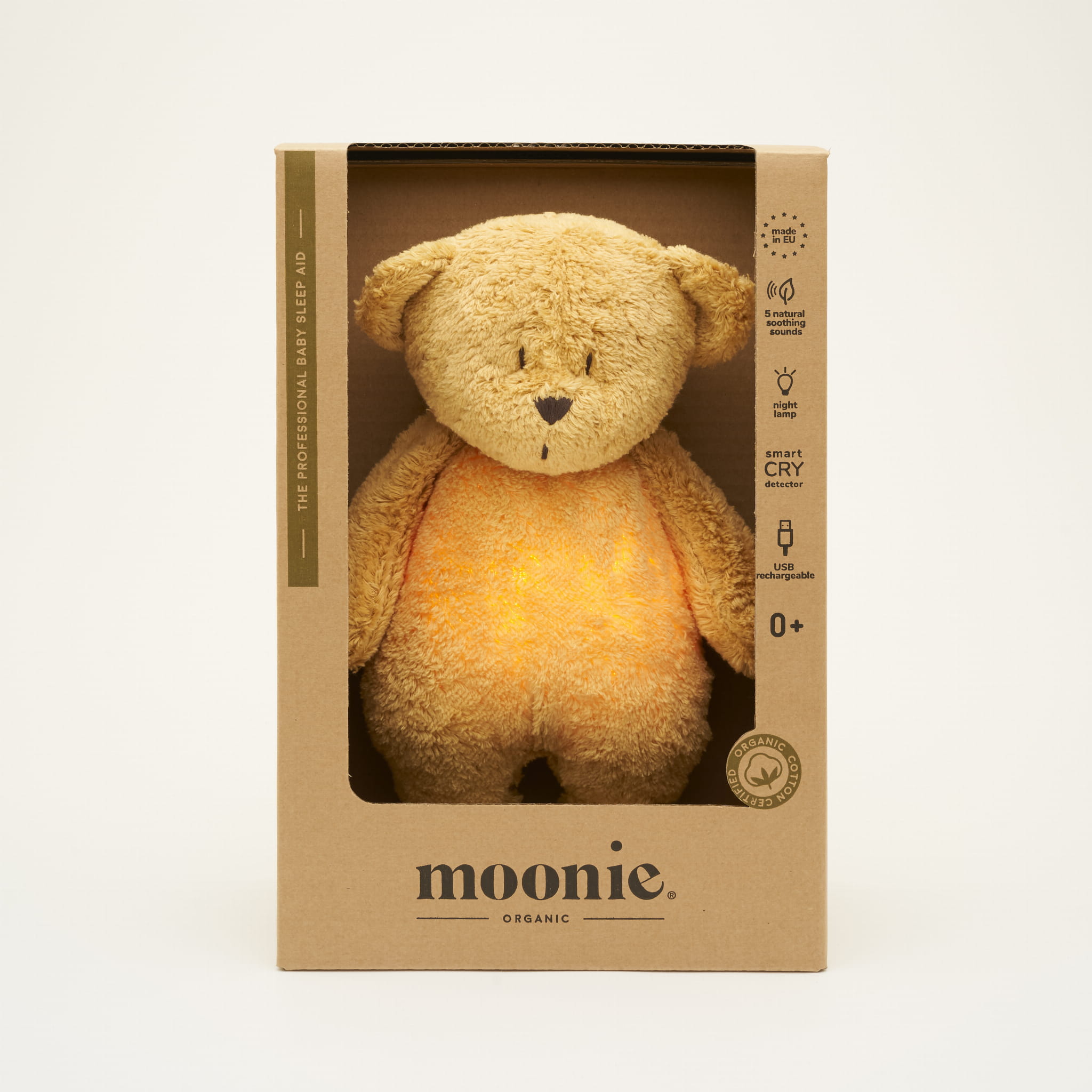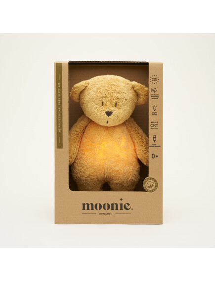 MOONIE ORGANIC 2.0: Приятелче за спокоен сън от органичен памук с нощна лампа и успокояващи звуци - МЕЧО "HONEY"