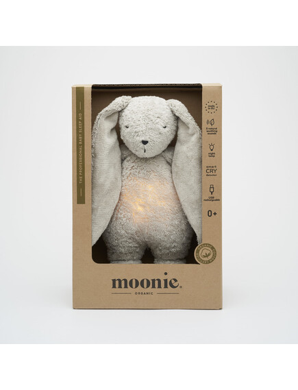 Зайо от колекцията MOONIE ORGANIC е професионален помощник за приспиване на бебета, изработено от сертифициран органичен памук. Благодарение на безвредниите, естествени звуци, които възпроизвежда, той помага на бебето или детето да се успокои и да заспи по-бързо. И това не е всичко! MOONIE също е нощна лампа, която може да свети в 7 различни цвята, има сензор за плач и се зарежда чрез USB. Красиво опакован, идеален за подарък!