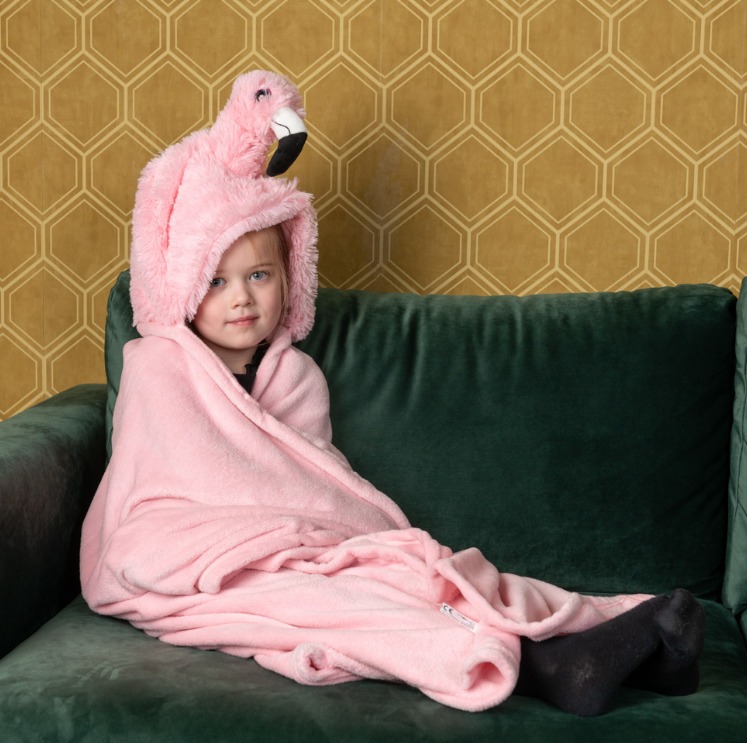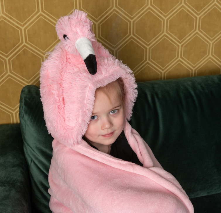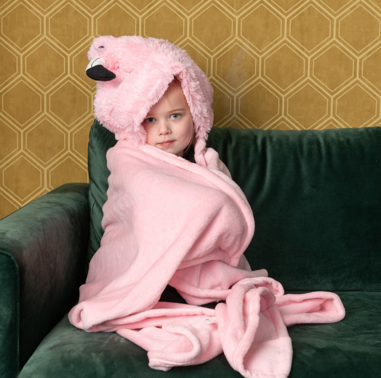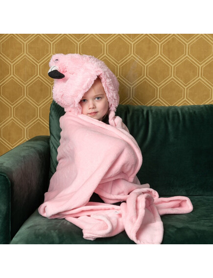 Голямо одеяло във формата на животно с качулка и джобчета за ръце, което може да се облича.