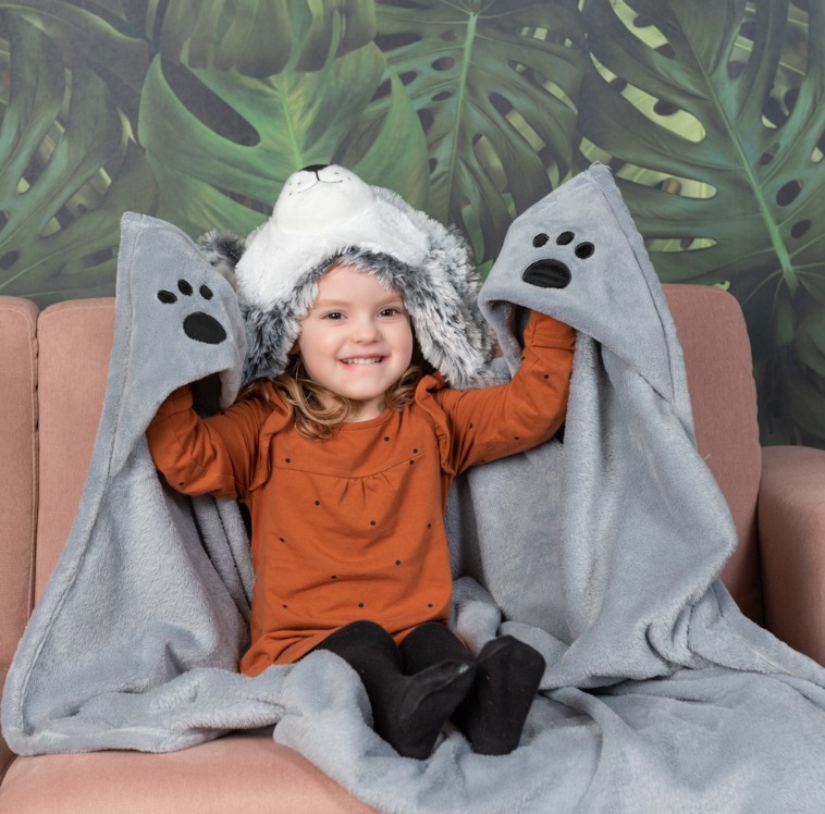 Голямо одеяло във формата на животно с качулка и джобчета за ръце, което може да се облича.