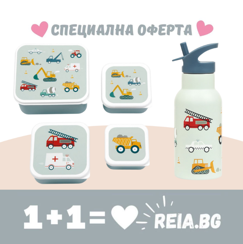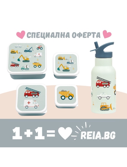 ОФЕРТА: A Little Lovely Company: Бутилка от неръждаема стомана и комплект от 4 бр кутии за храна - Vehicles