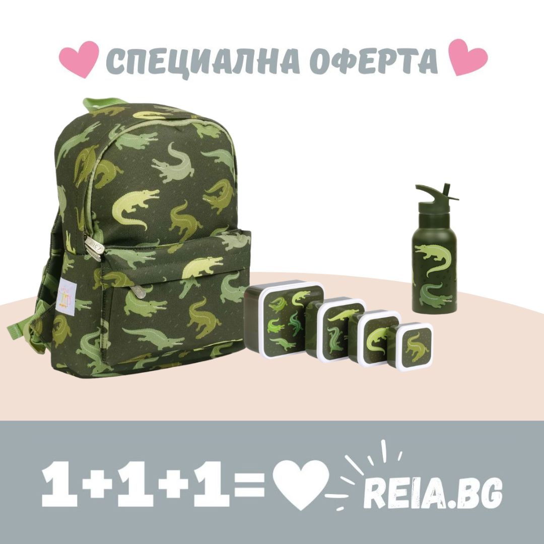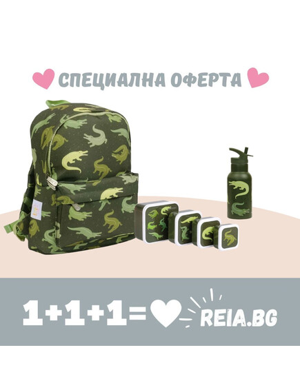 Комбо, което включва: Малка раница, комплект кутии за храна и бутилка от неръждаема стомана (Крокодилчета).