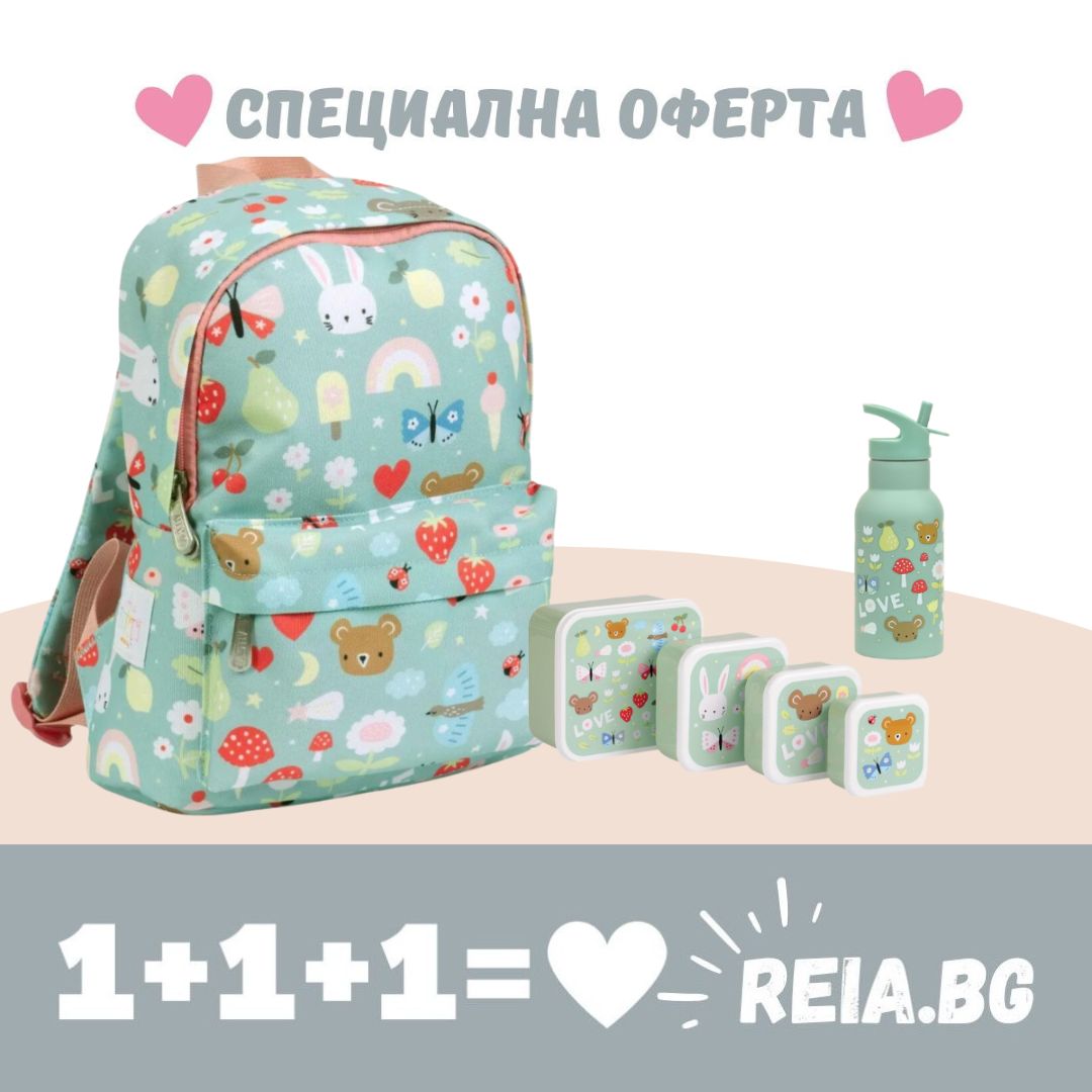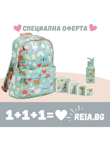 Комбо, което включва: Малка раница, бутилка от неръждаема стомана и комплект кутии за храна (Веселба).