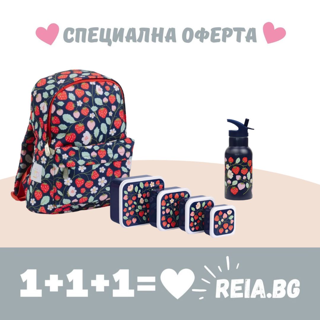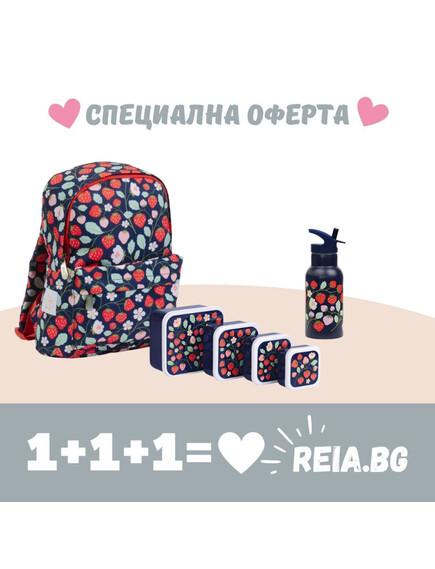 Комбо, което включва: Малка раница, комплект кутии за храна и бутилка от неръждаема стомана (Ягодки).