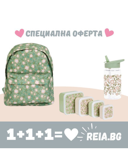 ОФЕРТА: A Little Lovely Company: Малка Раница 23.5x30x10см + Бутилка за вода от Тритан 450ml + Сет от 4 кутии за храна - Blossom Sage