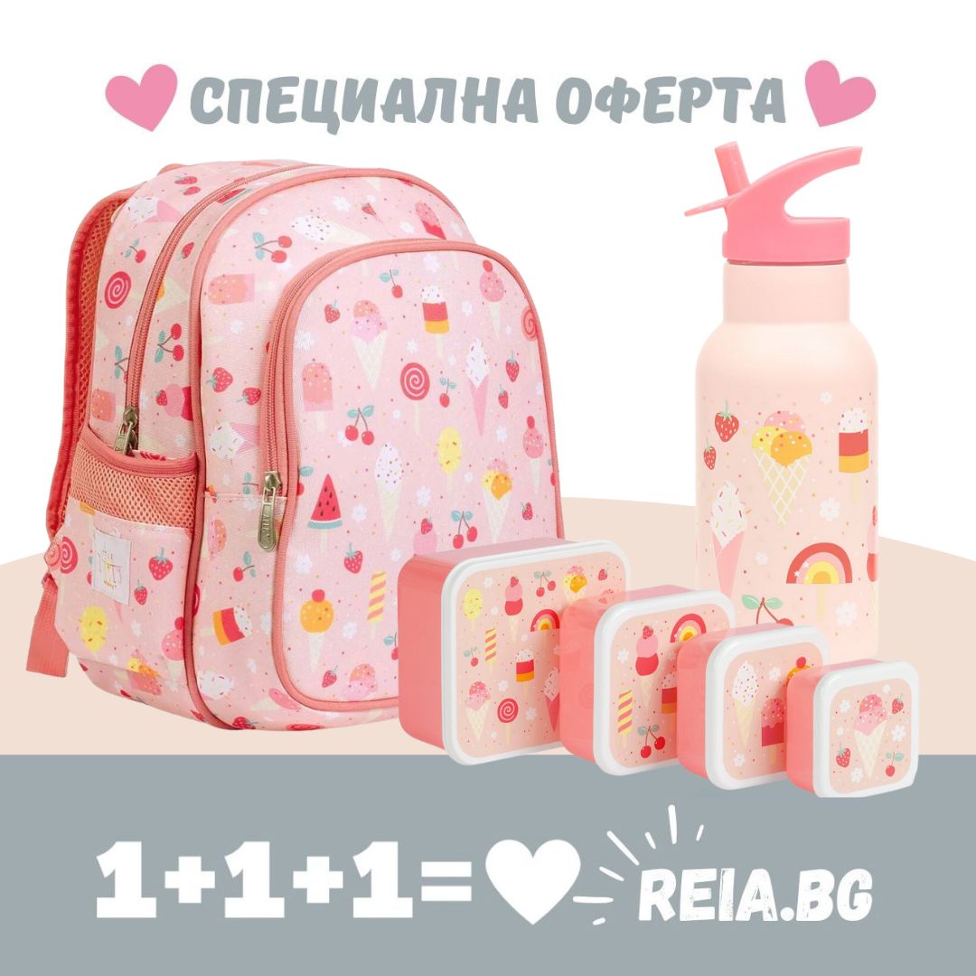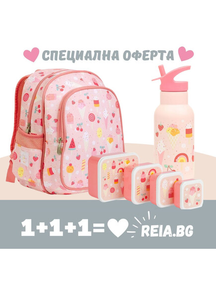 ОФЕРТА: A Little Lovely Company: Раница с изотермичен джоб 27 x 32 x 19 cm - "Сладолед" + Бутилка от неръждаема стомана със сламка: "Сладолед" + Комплект кутии за храна - "Сладолед"