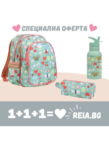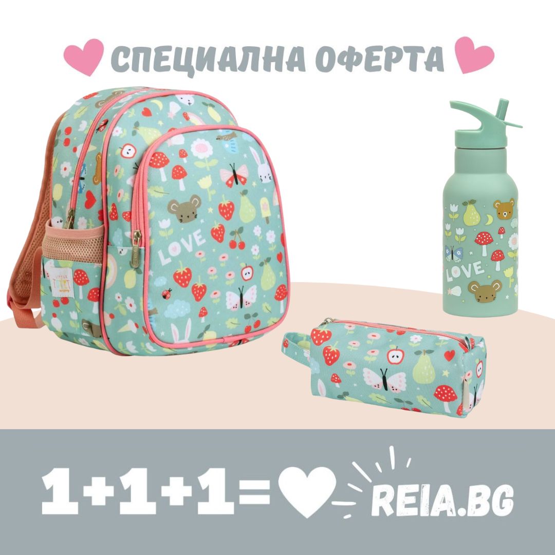 ОФЕРТА: A Little Lovely Company: Раница с изотермичен джоб 27 x 32 x 19 cm - "Веселба" + Несесер тип моливник - Веселба + Бутилка от неръждаема стомана със сламка: Веселба