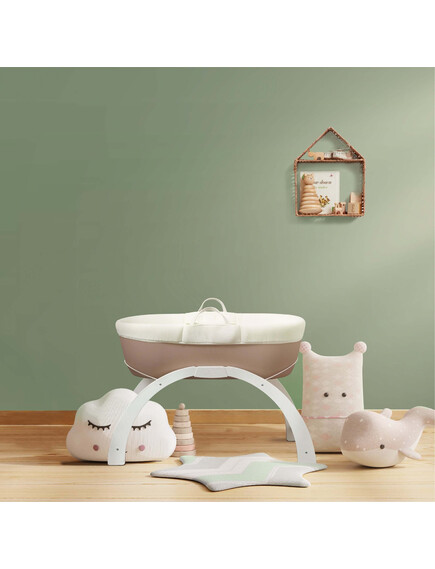 Иновативна алтернатива на традиционния кош с проветрива, хипоалергенна, дишаща материя, луксозен ватиран матрак и двупозиционна стойка за леко люлеене на ниско ниво или фиксирана позиция на високото ниво. Кошницата Shnuggle Dreami® е лесна за местене из дома, за да държи бебето близо до Вас ден и нощ.