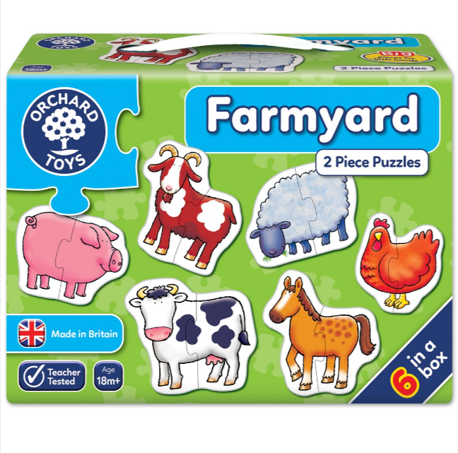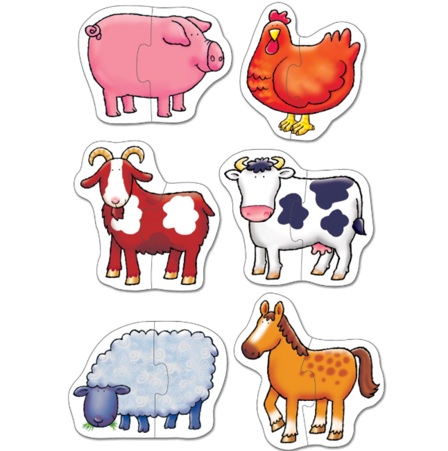 Комплектът съдържа 6 пъзела от 2 части, за деца на възраст над 18 месеца. Идеални са да запознаете детето си със света на пъзелите. Пъзелите включват различни животни от фермата, като прасе, пиле, крава, коза, кон и овца. След като децата успеят да сглобят пъзела, те могат да бъдат насърчени да признесат думата на глас. Децата могат да започнат да развиват своите умения за напасване и своите фини двигателни умения, докато се опитват да сглобят парчетата. Пъзелите са направени, така че, да издържат на игра с малките ръчички на Вашите деца.